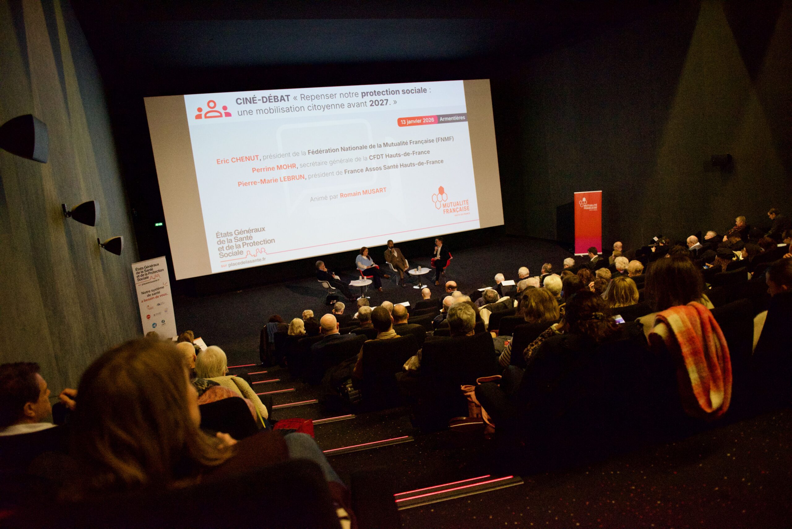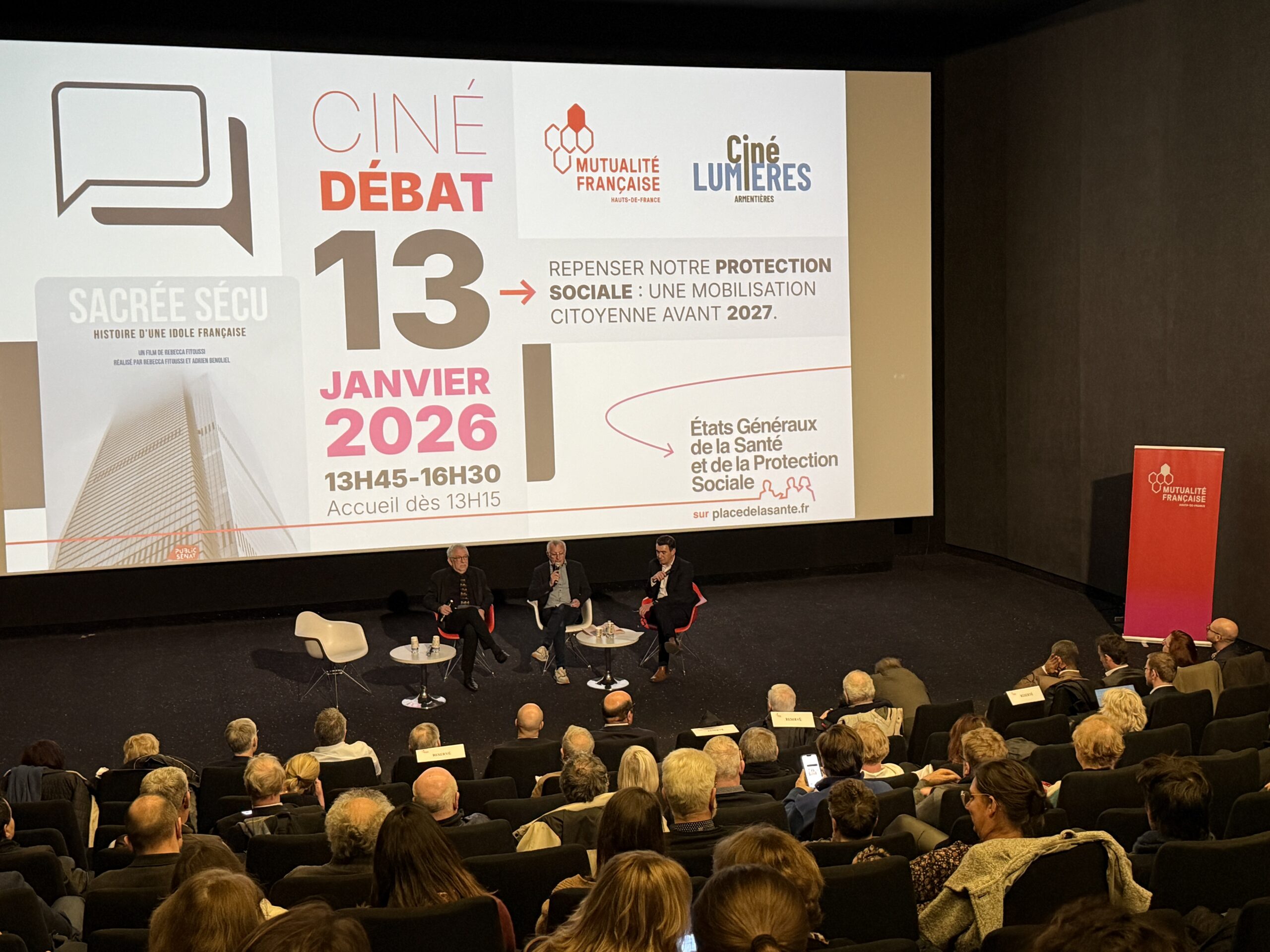 Organisé dans le cadre des États généraux de la santé et de la protection sociale, l’après-midi sous le thème « Repenser notre protection sociale : une mobilisation citoyenne avant 2027 » a réuni, au Ciné Lumières d’Armentières, citoyens, mutualistes, experts, acteurs et étudiants du médico-social avec en introduction « Sacrée Sécu », 50 minutes d’images d’archives et de témoignages compilés par Rebecca FITOUSSI. Cette coproduction Public Sénat et Mutualité Française salue les 80 ans d’Histoire de notre protection sociale, véritable modèle à l’étranger, et retrace ses origines solidaires, ses mythes, ses tabous et ses défis actuels face au déficit, aux évolutions sociétales et à la fragilisation du système.