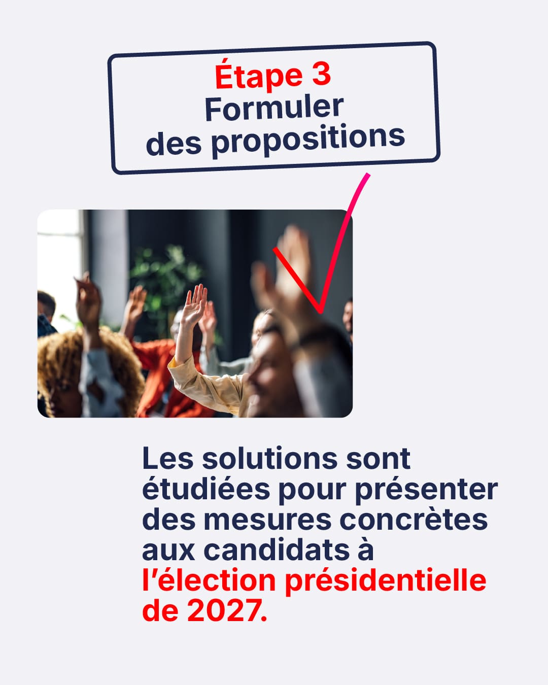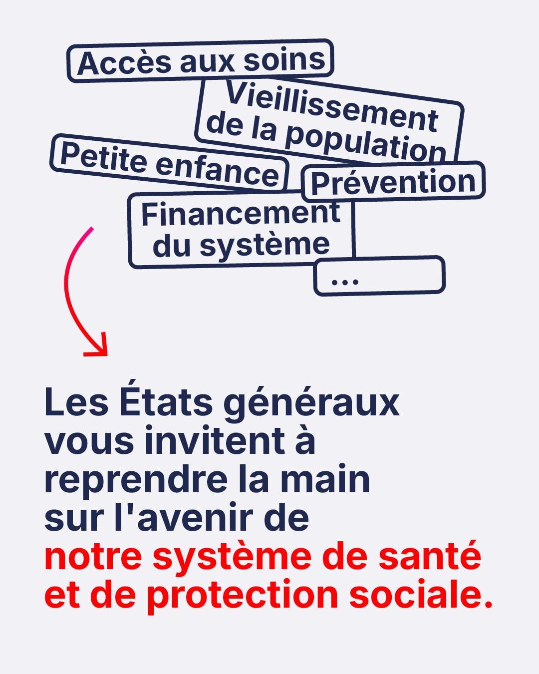 Les thématiques : Conditions de travail et valorisation des professionnels du soin et de l’accompagnement ; Financement et épargne ; Gouvernance, organisation et coordination de la protection sociale ; Prévention ; Santé et environnement.